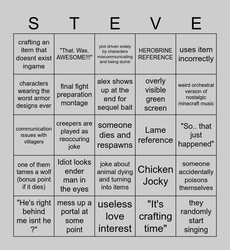 This bingo card has 25 words: Idiot looks ender man in the eyes, useless love interest, alex shows up at the end for sequel bait, "He's right behind me isnt he ?", uses item incorrectly, crafting an item that doesnt exist ingame, characters wearing the worst armor designs ever, "That. Was. AWESOME!!!", Lame reference, joke about animal dying and turning into items, overly visible green screen, communication issues with villagers, Chicken Jocky, someone accidentally poisons themselves, final fight preparation montage, they randomly start singing, "So.. that just happened", plot driven solely by characters miscommunicating and being dumb, weird orchestral version of nostalgic minecraft music, creepers are played as reoccuring joke, someone dies and respawns, mess up a portal at some point, one of them tames a wolf (bonus point if it dies), HEROBRINE REFERENCE and "It's crafting time".