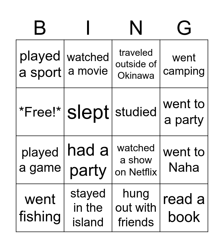 This bingo card has 16 words: stayed in the island, went to Naha, traveled outside of Okinawa, played a sport, played a game, watched a movie, watched a show on Netflix, hung out with friends, *Free!*, slept, went fishing, went camping, had a party, went to a party, studied and read a book.