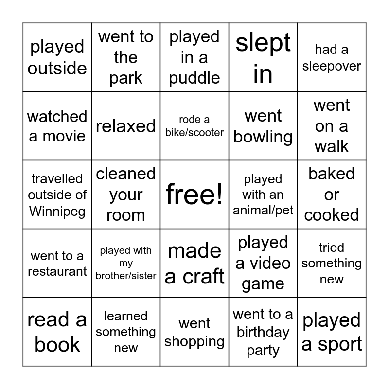 This bingo card has a free space and 24 words: read a book, played with my brother/sister, rode a bike/scooter, went to a birthday party, had a sleepover, played outside, went to the park, played in a puddle, played with an animal/pet, baked or cooked, travelled outside of Winnipeg, relaxed, played a video game, tried something new, watched a movie, learned something new, went shopping, slept in, went on a walk, went to a restaurant, cleaned your room, made a craft, went bowling and played a sport.