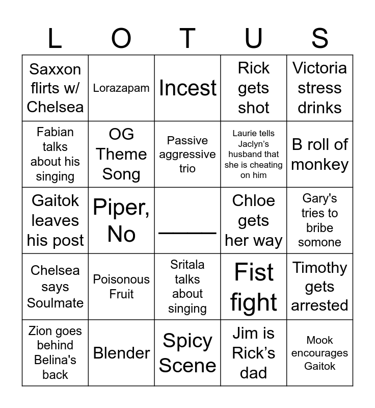This bingo card has a free space and 24 words: Poisonous Fruit, Blender, Passive aggressive trio, Zion goes behind Belina's back, Victoria stress drinks, Saxxon flirts w/ Chelsea, Fabian talks about his singing, Lorazapam, Chloe gets her way, Sritala talks about singing, Laurie tells Jaclyn’s husband that she is cheating on him, Gaitok leaves his post, Fist fight, Timothy gets arrested, OG Theme Song, Jim is Rick’s dad, Gary's tries to bribe somone, Incest, B roll of monkey, Piper, No, Mook encourages Gaitok, Chelsea says Soulmate, Rick gets shot and Spicy Scene.