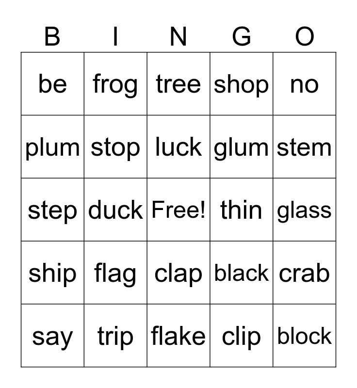 This bingo card has a free space and 24 words: flag, trip, luck, say, no, be, plum, frog, thin, clap, glum, step, black, crab, stop, clip, glass, tree, stem, duck, block, ship, shop and flake.