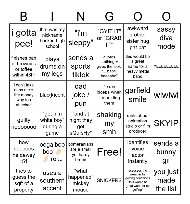 This bingo card has 36 words: Free!, pomeranians are a small yet hardy breed, SNICKERS, finishes pan of brownies or toffee within 48hr, guilty nooooooo, flexes biceps when i'm holding them, plays drums on my legs, "what happened" mickey mouse, awkward brother sister hug pat pat, identifies voice actor instantly, YEEEEEEEEE, "GYIT IT" or "GRAB IT", sends a bunny gif, blac(k)cent, quotes smthing + gives the look: "....babe. baaaabe", i gotta pee!, how dooooes he dewey it?!, garfield smile, i don't take naps me + the money way too attached, "i'm sleppy", dad joke / pun, "get him white boy" during a game, shaking my smh, "and at night they get sQuIsHy", rants about animation studio or film producer, that was my nickname back in high school, this would be a great name for a heavy metal band, uses a southern accent, sends a sports tiktok, sassy diva mode, you just made the list, tries to guess the sqft of a property, SKYIP, wiwiwi, ooga boo boo š¤š»š¤š» roku and assesses the weather by golfing conditions "this would be great weather for golfing".