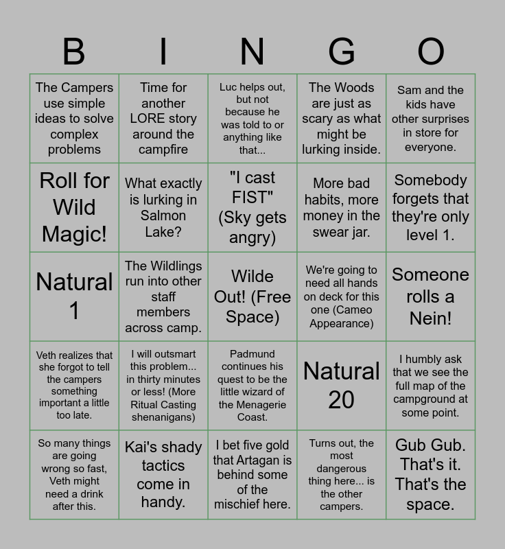 This bingo card has a free space and 24 words: I will outsmart this problem... in thirty minutes or less! (More Ritual Casting shenanigans), Kai's shady tactics come in handy., "I cast FIST" (Sky gets angry), So many things are going wrong so fast, Veth might need a drink after this., Sam and the kids have other surprises in store for everyone., The Campers use simple ideas to solve complex problems, Roll for Wild Magic!, Time for another LORE story around the campfire, We're going to need all hands on deck for this one (Cameo Appearance), Padmund continues his quest to be the little wizard of the Menagerie Coast., More bad habits, more money in the swear jar., Natural 1, Natural 20, I humbly ask that we see the full map of the campground at some point., What exactly is lurking in Salmon Lake?, Turns out, the most dangerous thing here... is the other campers., Someone rolls a Nein!, Luc helps out, but not because he was told to or anything like that..., Somebody forgets that they're only level 1., The Wildlings run into other staff members across camp., Gub Gub. That's it. That's the space., Veth realizes that she forgot to tell the campers something important a little too late., The Woods are just as scary as what might be lurking inside. and I bet five gold that Artagan is behind some of the mischief here..