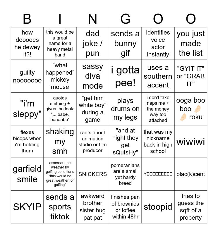This bingo card has 36 words: pomeranians are a small yet hardy breed, SNICKERS, finishes pan of brownies or toffee within 48hr, guilty nooooooo, flexes biceps when i'm holding them, plays drums on my legs, "what happened" mickey mouse, awkward brother sister hug pat pat, identifies voice actor instantly, YEEEEEEEEE, "GYIT IT" or "GRAB IT", sends a bunny gif, blac(k)cent, quotes smthing + gives the look: "....babe. baaaabe", i gotta pee!, how dooooes he dewey it?!, garfield smile, i don't take naps me + the money way too attached, "i'm sleppy", dad joke / pun, "get him white boy" during a game, shaking my smh, "and at night they get sQuIsHy", rants about animation studio or film producer, that was my nickname back in high school, this would be a great name for a heavy metal band, uses a southern accent, sends a sports tiktok, sassy diva mode, you just made the list, tries to guess the sqft of a property, SKYIP, wiwiwi, ooga boo boo š¤š»š¤š» roku, assesses the weather by golfing conditions "this would be great weather for golfing" and stoopid.