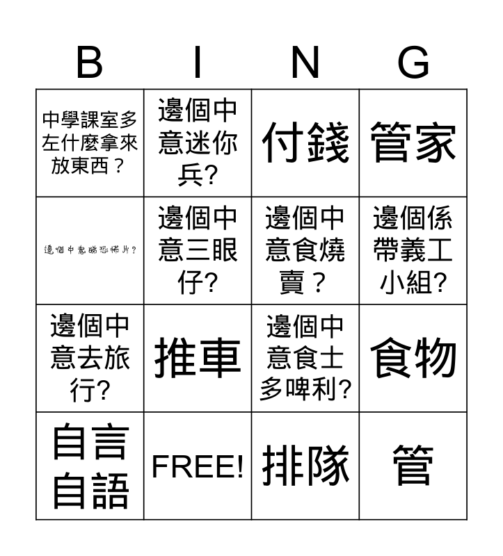 This bingo card has 1 images and 24 words: 中學有什麼學會, 中學多左什麼科目?, 邊個係帶義工小組?, 邊個最想去瑞士呢?, 中學課室多左什麼拿來放東西?, 邊個中意三眼仔?, 邊個中意迷你兵?, FREE!, 邊個中意影相?, 邊個中意去旅行?, 邊個中意食士多啤利?, 邊個中意布甸狗, 邊個中意整野食, 邊個中意食燒賣?, 邊個中意打籃球?, 排隊, 付錢, 推車, 食物, 自言自語, 錢包, 管, 管家 and 牛肉.