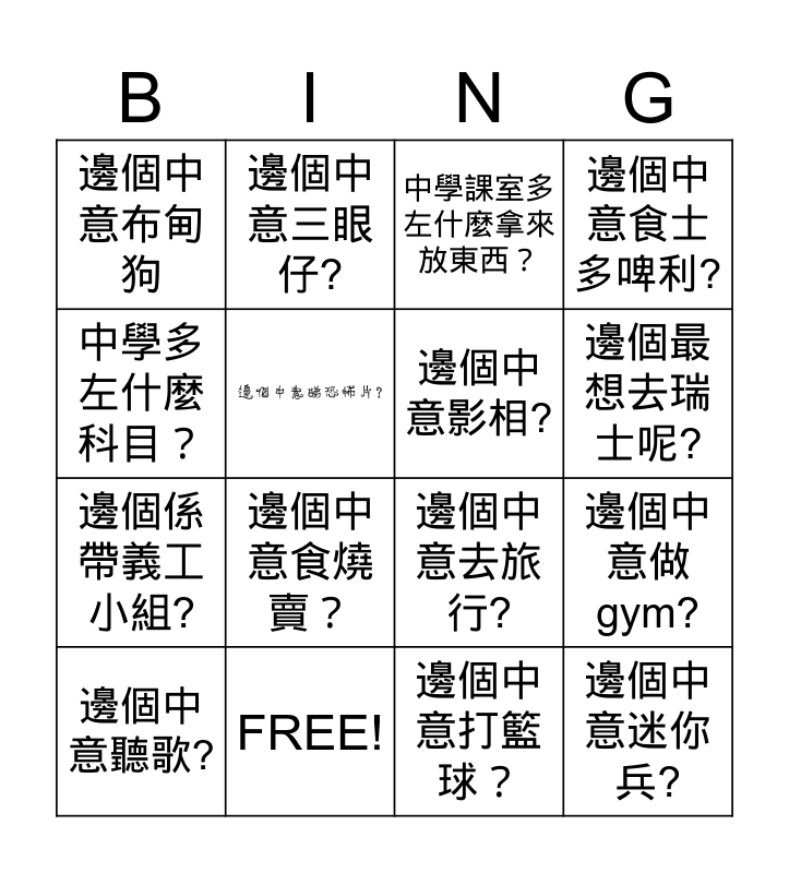 This bingo card has 1 images and 27 words: 中學有什麼學會, 中學多左什麼科目?, 邊個係帶義工小組?, 邊個最想去瑞士呢?, 中學課室多左什麼拿來放東西?, 邊個中意三眼仔?, 邊個中意迷你兵?, FREE!, 邊個中意影相?, 邊個中意去旅行?, 邊個中意食士多啤利?, 邊個中意布甸狗, 邊個中意整野食, 邊個中意食燒賣?, 邊個中意打籃球?, 邊個中意lulu豬, 邊個中意影相?, 邊個最想去瑞士呢?, 邊個中意士多啤利, 邊個中意布甸狗, 邊個中意整野食, 邊個中意聽歌?, 邊個中意做gym?, 邊個中意打籃球?, 中學課室多左什麼拿來放東西?, 中學多左什麼科目? and 邊個係帶義工小組?.