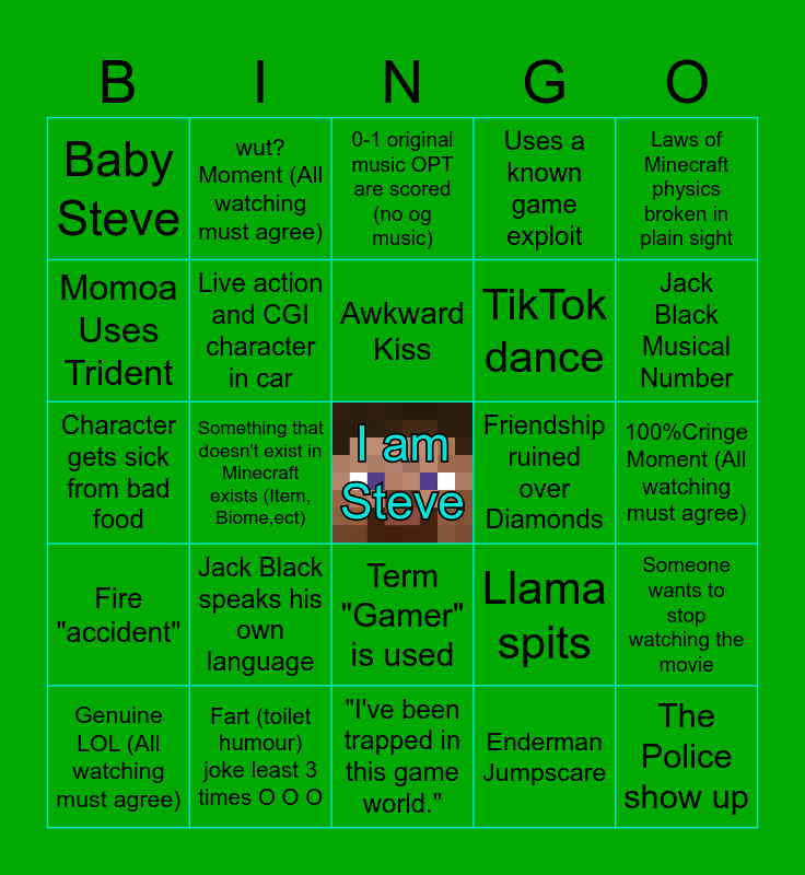This bingo card has a free space and 29 words: Genuine LOL (All watching must agree), Jason Momoa is a feminist, Something that doesn't exist in Minecraft exists (Item, Biome,ect), Youtuber or Streamer Cameo, Baby Steve, 0-1 original music OPT are scored (no og music), Live action and CGI character in car, Jack Black speaks his own language, Friendship ruined over Diamonds, Fart (toilet humour) joke least 3 times O O O, 100%Cringe Moment (All watching must agree), The Police show up, "I've been trapped in this game world.", Enderman Jumpscare, Jack Black Musical Number, Kids know better than adults or reason, Term "Gamer" is used, Fire "accident", Laws of Minecraft physics broken in plain sight, Character gets sick from bad food, Llama spits, Someone digs straight down, TikTok dance, Momoa Uses Trident, Uses a known game exploit, wut?Moment (All watching must agree), Someone wants to stop watching the movie, Awkward Kiss and Tool breaks at inconvenient time.