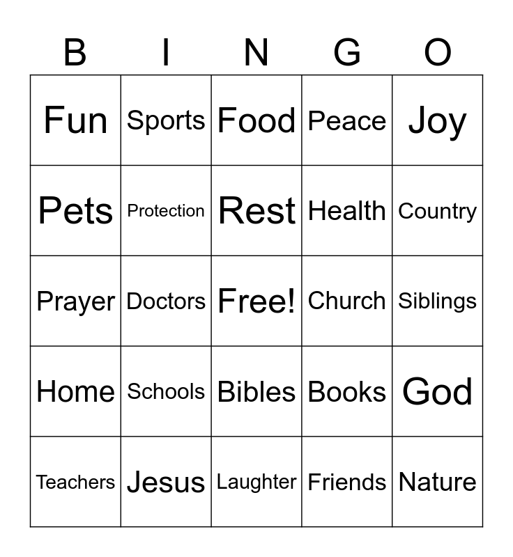 This bingo card has a free space and 28 words: God, Family, Health, Friends, Pets, Food, Sports, Home, Church, Teachers, Prayer, Peace, Jesus, Laughter, Country, Freedom, Schools, Protection, Rest, Bibles, Fun, Parents, Nature, Doctors, Siblings, Books, Joy and Games.