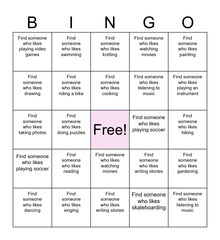 This bingo card has a free space and 24 words: Find someone who likes reading, Find someone who likes singing, Find someone who likes cooking, Find someone who likes dancing, Find someone who likes painting, Find someone who likes playing video games, Find someone who likes drawing, Find someone who likes swimming, Find someone who likes playing soccer, Find someone who likes watching movies, Find someone who likes listening to music, Find someone who likes taking photos, Find someone who likes writing stories, Find someone who likes gardening, Find someone who likes riding a bike, Find someone who likes skateboarding, Find someone who likes hiking, Find someone who likes knitting, Find someone who likes playing an instrument, Find someone who likes doing puzzles, Find someone who likes listening to music, Find someone who likes playing soccer, Find someone who likes watching movies and Find someone who likes writing stories.