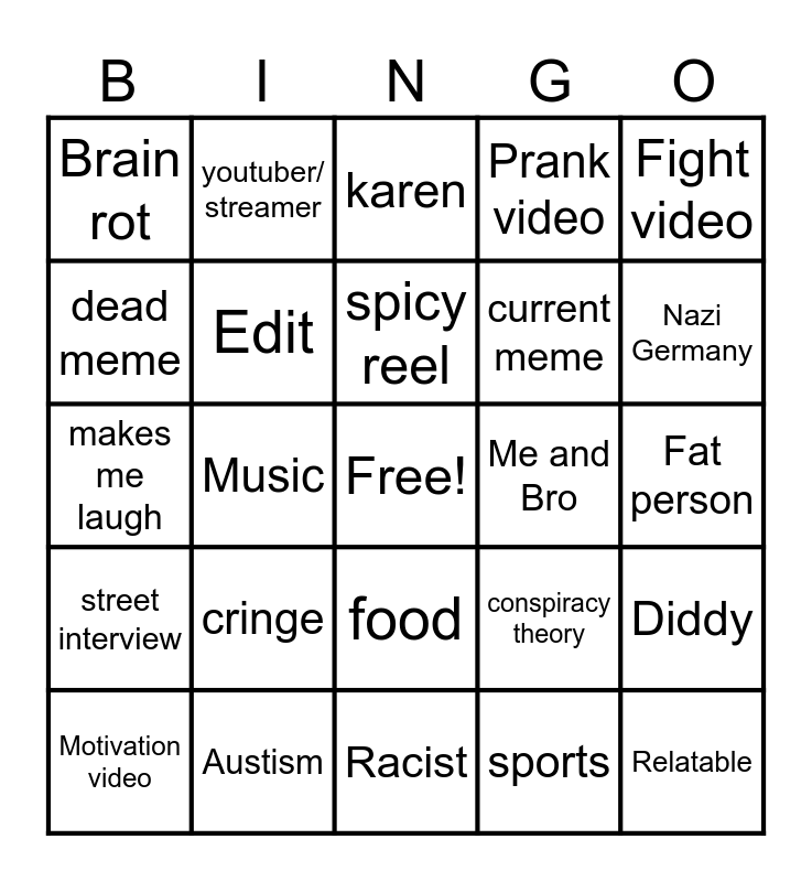 This bingo card has a free space and 24 words: cringe, Austism, spicy reel, Motivation video, Fight video, Brain rot, dead meme, youtuber/ streamer, Me and Bro, food, current meme, makes me laugh, conspiracy theory, Diddy, Edit, sports, Fat person, karen, Nazi Germany, Music, Relatable, street interview, Prank video and Racist.