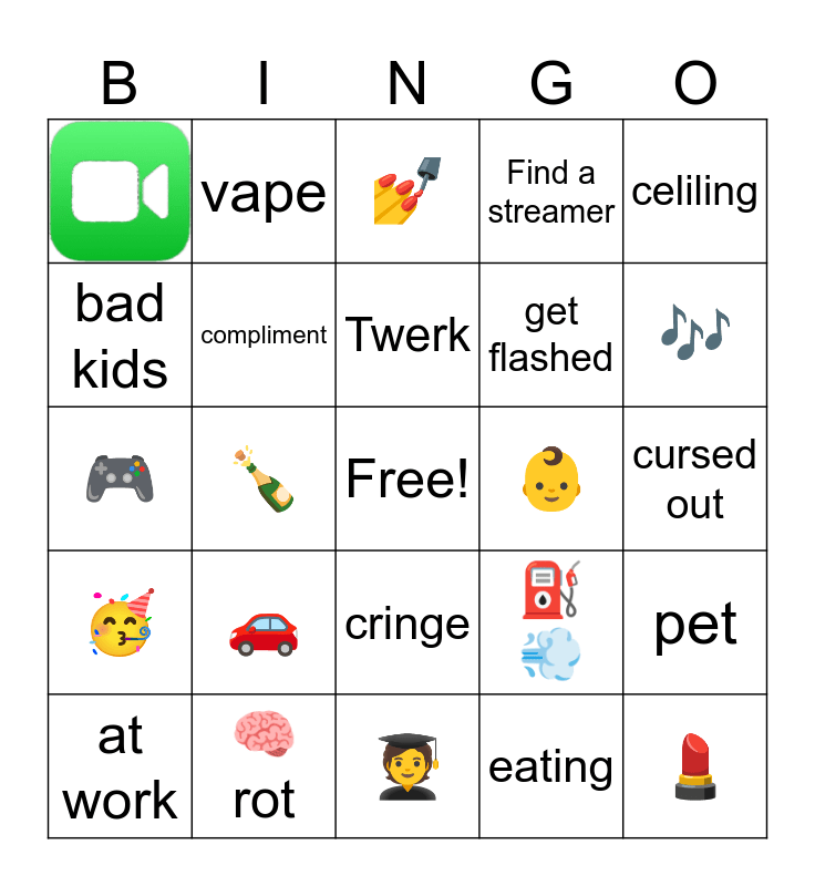 This bingo card has 1 images, a free space and 23 words: 🚗, 🧠 rot, Twerk, at work, celiling, bad kids, vape, 👶, cringe, get flashed, 🎮, ⛽️💨, pet, compliment, eating, cursed out, 💅, 🎶, 🍾, 💄, 🥳, Find a streamer and 🧑🎓.