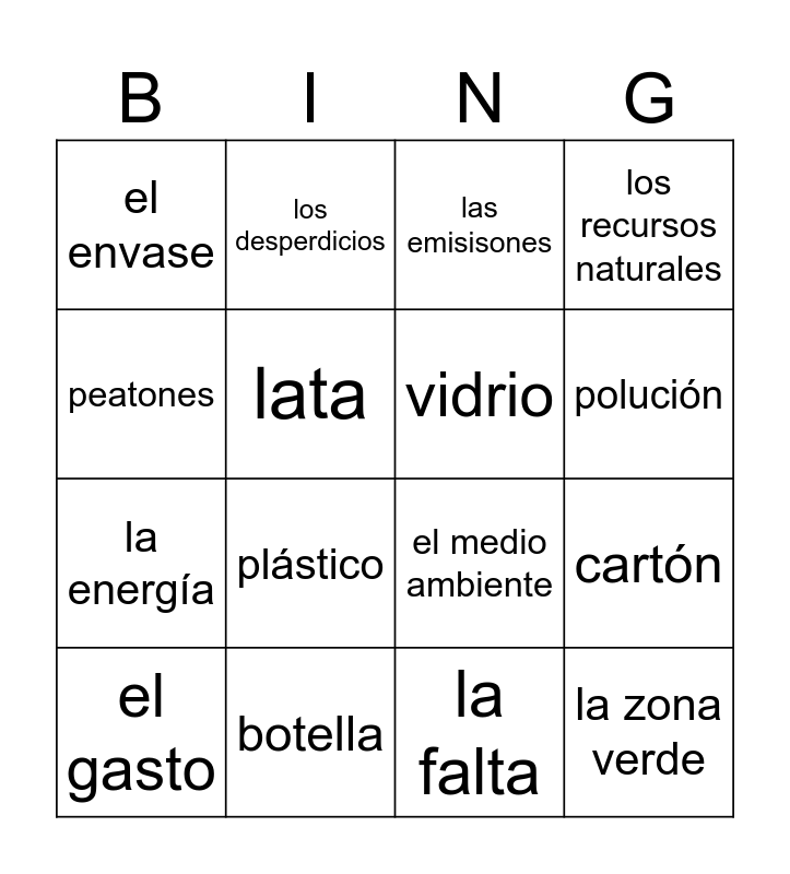 This bingo card has 16 words: botella, cartón, las emisisones, el envase, la energía, los desperdicios, el medio ambiente, la falta, peatones, lata, el gasto, los recursos naturales, plástico, polución, vidrio and la zona verde.