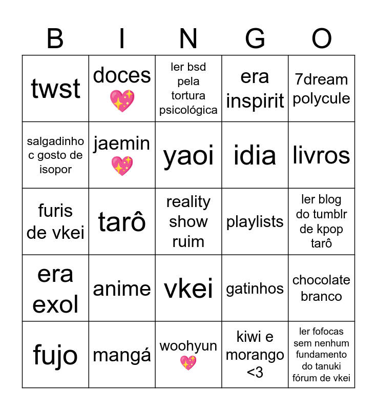 This bingo card has a free space and 24 words: anime, mangá, yaoi, fujo, 7dream polycule, twst, salgadinho c gosto de isopor, doces 💖, playlists, vkei, idia, furis de vkei, gatinhos, chocolate branco, jaemin 💖, kiwi e morango <3, ler blog do tumblr de kpop tarô, ler bsd pela tortura psicológica, livros, tarô, ler fofocas sem nenhum fundamento do tanuki fórum de vkei, era exol, era inspirit and woohyun 💖.