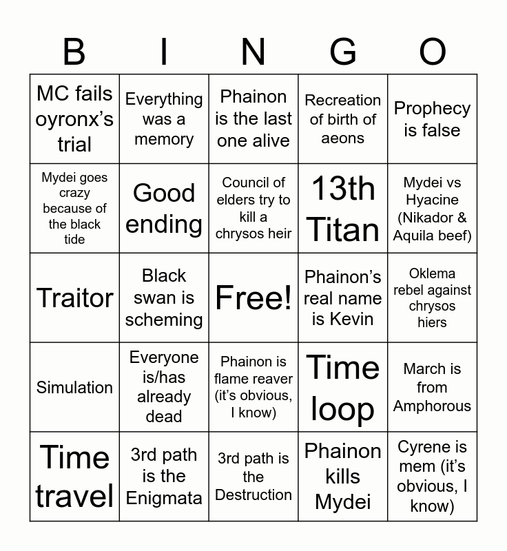 This bingo card has a free space and 24 words: Everyone is/has already dead, 3rd path is the Enigmata, Council of elders try to kill a chrysos heir, Time travel, Prophecy is false, MC fails oyronx’s trial, Mydei goes crazy because of the black tide, Everything was a memory, Phainon’s real name is Kevin, Phainon is flame reaver (it’s obvious, I know), 13th Titan, Traitor, Time loop, March is from Amphorous, Good ending, Phainon kills Mydei, Oklema rebel against chrysos hiers, Phainon is the last one alive, Mydei vs Hyacine (Nikador & Aquila beef), Black swan is scheming, Cyrene is mem (it’s obvious, I know), Simulation, Recreation of birth of aeons and 3rd path is the Destruction.