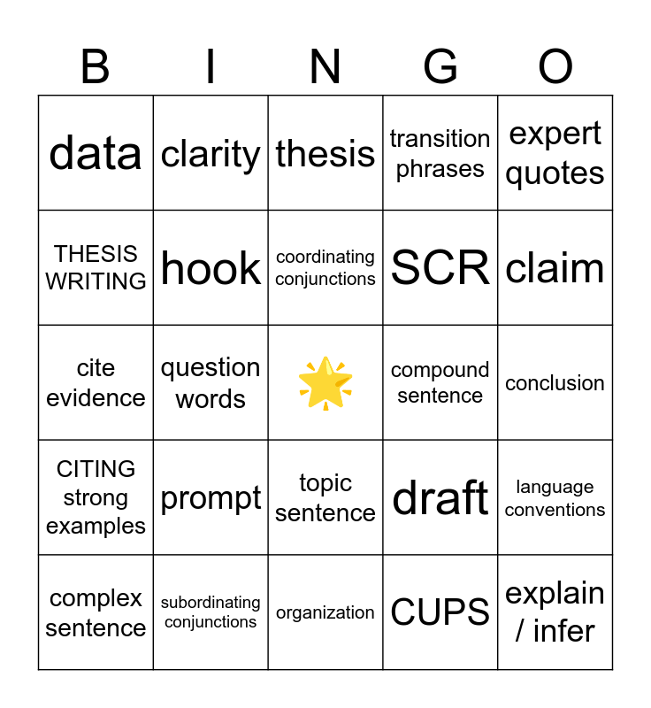This bingo card has a free space and 24 words: complex sentence, prompt, coordinating conjunctions, CUPS, expert quotes, data, clarity, thesis, compound sentence, conclusion, cite evidence, hook, draft, language conventions, THESIS WRITING, subordinating conjunctions, organization, transition phrases, claim, CITING strong examples, question words, topic sentence, SCR and explain / infer.