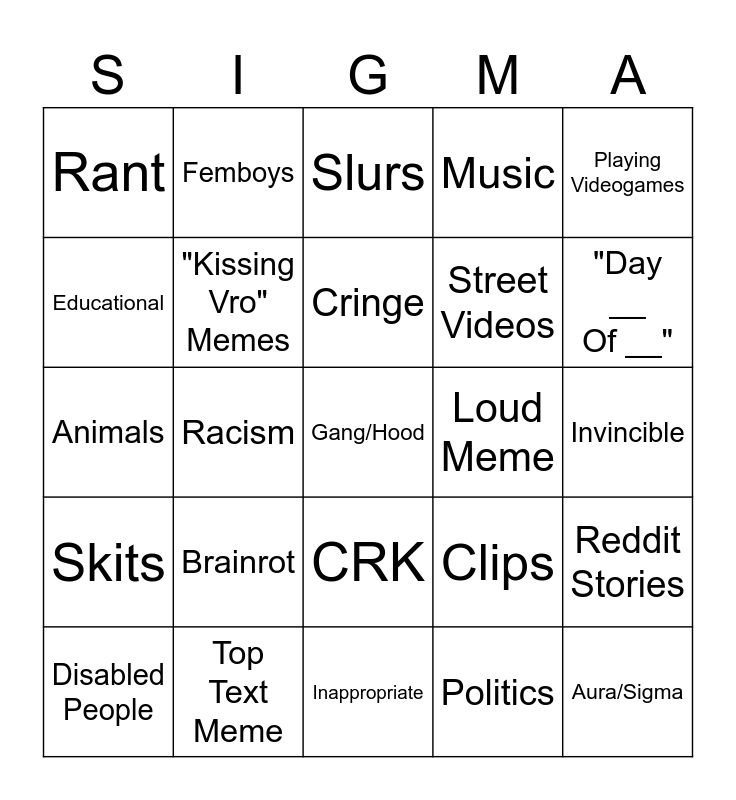 This bingo card has 25 words: Brainrot, Inappropriate, Cringe, Disabled People, Playing Videogames, Rant, Educational, Femboys, Loud Meme, CRK, Street Videos, Animals, Clips, Reddit Stories, "Kissing Vro" Memes, Aura/Sigma, Invincible, Slurs, "Day __ Of __", Racism, Gang/Hood, Top Text Meme, Skits, Music and Politics.