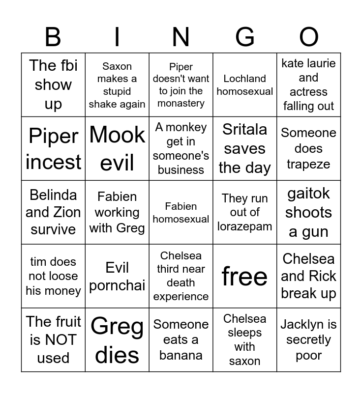 This bingo card has 25 words: Evil pornchai, Someone eats a banana, A monkey get in someone's business, The fruit is NOT used, kate laurie and actress falling out, The fbi show up, Piper incest, Saxon makes a stupid shake again, They run out of lorazepam, Chelsea third near death experience, Sritala saves the day, Belinda and Zion survive, free, Chelsea and Rick break up, Mook evil, Jacklyn is secretly poor, gaitok shoots a gun, Piper doesn't want to join the monastery, Someone does trapeze, Fabien working with Greg, Fabien homosexual, Greg dies, tim does not loose his money, Lochland homosexual and Chelsea sleeps with saxon.