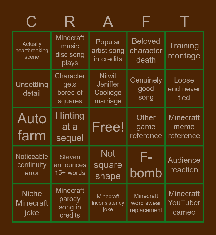 This bingo card has a free space and 24 words: Steven announces 15+ words, Minecraft parody song in credits, Nitwit Jeniffer Coolidge marriage, Niche Minecraft joke, Training montage, Actually heartbreaking scene, Unsettling detail, Minecraft music disc song plays, Other game reference, Not square shape, Genuinely good song, Auto farm, F-bomb, Audience reaction, Character gets bored of squares, Minecraft word swear replacement, Minecraft meme reference, Popular artist song in credits, Loose end never tied, Hinting at a sequel, Minecraft YouTuber cameo, Noticeable continuity error, Beloved character death and Minecraft inconsistency joke.
