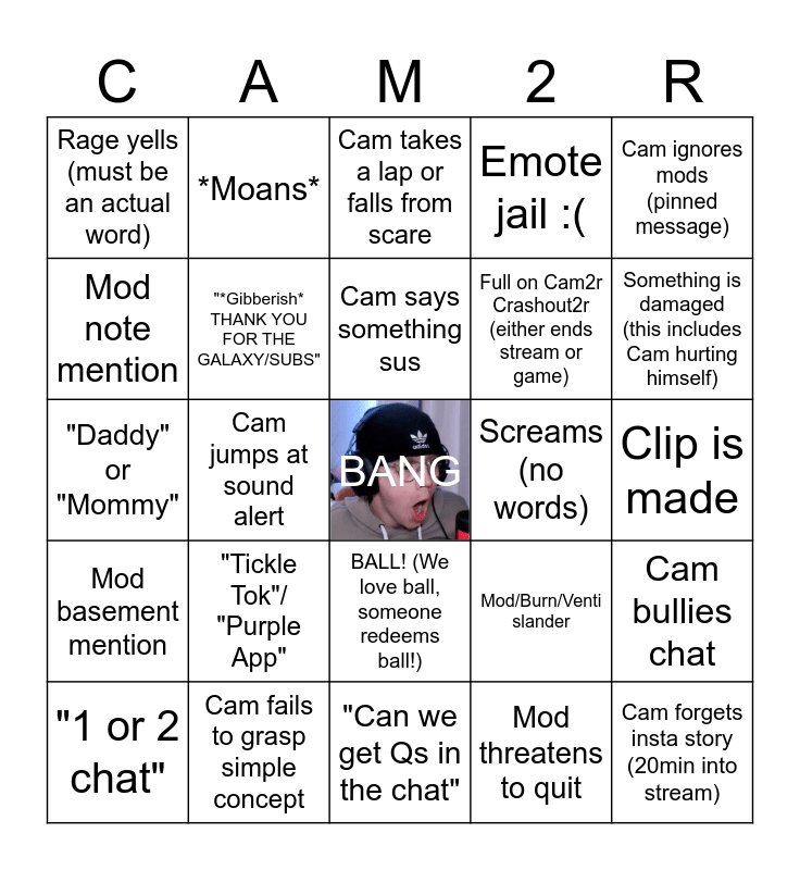 This bingo card has a free space and 36 words: Handsome orange men mentioned, Cam attempts to and fails at reading, "Can we get a timeout out on...", "*Gibberish* THANK YOU FOR THE GALAXY/SUBS", Mod/Burn/Venti slander, Mod basement mention, Cam says something sus, *immediately echos sound alert*, Cam ignores mods (pinned message), TTS made to say something unholy, Cam jumps at sound alert, Emote jail :(, Cam ignores chat trying to help, Screams (no words), Something is damaged (this includes Cam hurting himself), Rage yells (must be an actual word), Cam struggles to talk, "Tickle Tok"/ "Purple App", Cam forgets insta story (20min into stream), Cam takes a lap or falls from scare, Clip is made, Cam bullies chat, Cam fails to grasp simple concept, "1 or 2 chat", "Can we get Qs in the chat", *Moans*, "Daddy" or "Mommy", Cam gives the salad finger (Flips off camera), Full on Cam2r Crashout2r (either ends stream or game), Mod note mention, Mods crashing out bc of cam, "How long until game starts" prediction is made, Mod threatens to quit, BALL! (We love ball, someone redeems ball!), 25+ min of yap (non-just chatting stream) and Cam falls out of chair :/.