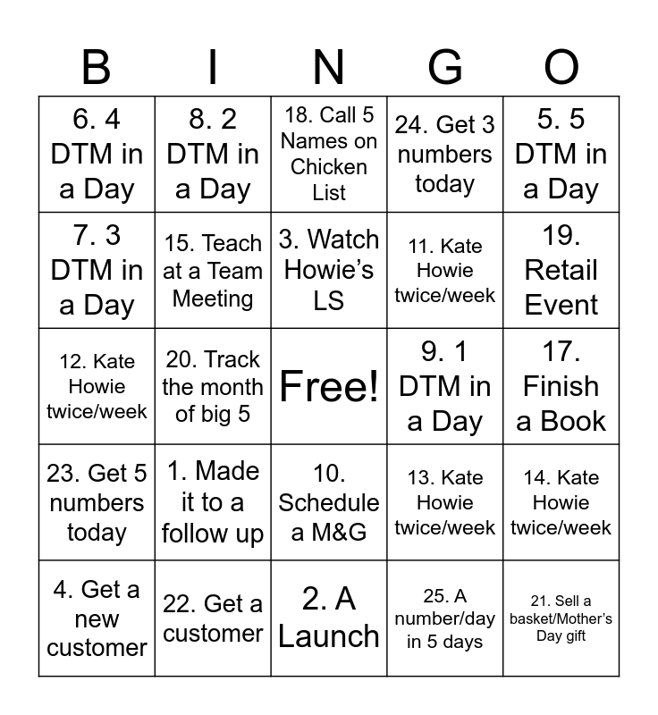 This bingo card has a free space and 25 words: 1. Made it to a follow up, 2. A Launch, 3. Watch Howie’s LS, 4. Get a new customer, 5. 5 DTM in a Day, 6. 4 DTM in a Day, 7. 3 DTM in a Day, 8. 2 DTM in a Day, 9. 1 DTM in a Day, 10. Schedule a M&G, 11. Kate Howie twice/week, 12. Kate Howie twice/week, 13. Kate Howie twice/week, 14. Kate Howie twice/week, 15. Teach at a Team Meeting, 16. Bring a guest to a BP, 17. Finish a Book, 18. Call 5 Names on Chicken List, 19. Retail Event, 20. Track the month of big 5, 21. Sell a basket/Mother’s Day gift, 22. Get a customer, 23. Get 5 numbers today, 24. Get 3 numbers today and 25. A number/day in 5 days.