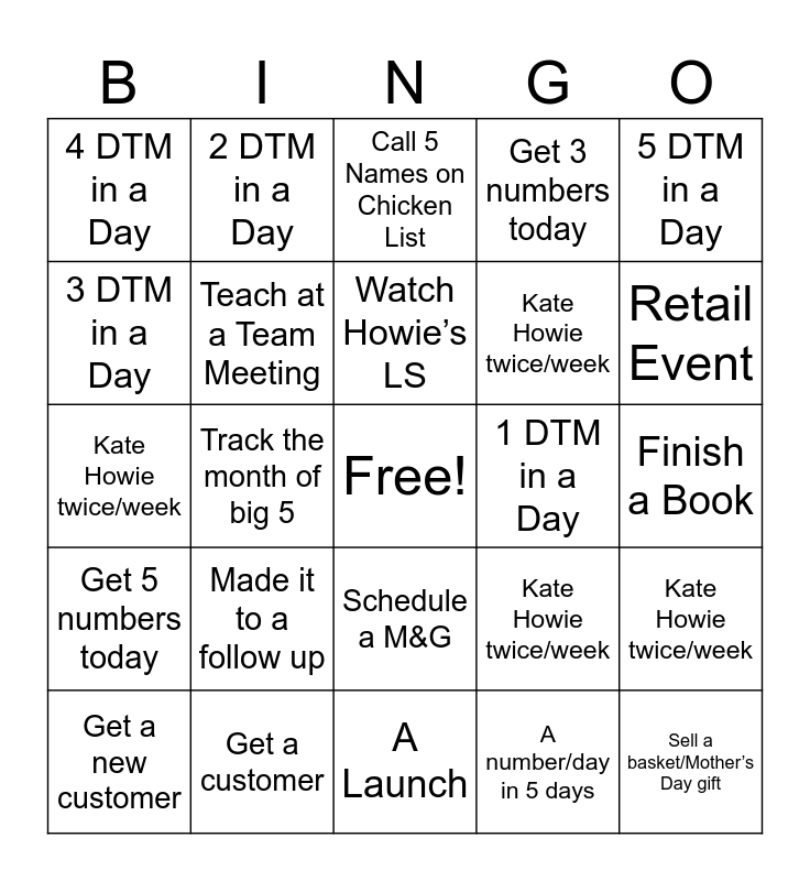This bingo card has a free space and 25 words: Made it to a follow up, A Launch, Watch Howie’s LS, Get a new customer, 5 DTM in a Day, 4 DTM in a Day, 3 DTM in a Day, 2 DTM in a Day, 1 DTM in a Day, Schedule a M&G, Kate Howie twice/week, Kate Howie twice/week, Kate Howie twice/week, Kate Howie twice/week, Teach at a Team Meeting, Bring a guest to a BP, Finish a Book, Call 5 Names on Chicken List, Retail Event, Track the month of big 5, Sell a basket/Mother’s Day gift, Get a customer, Get 5 numbers today, Get 3 numbers today and A number/day in 5 days.