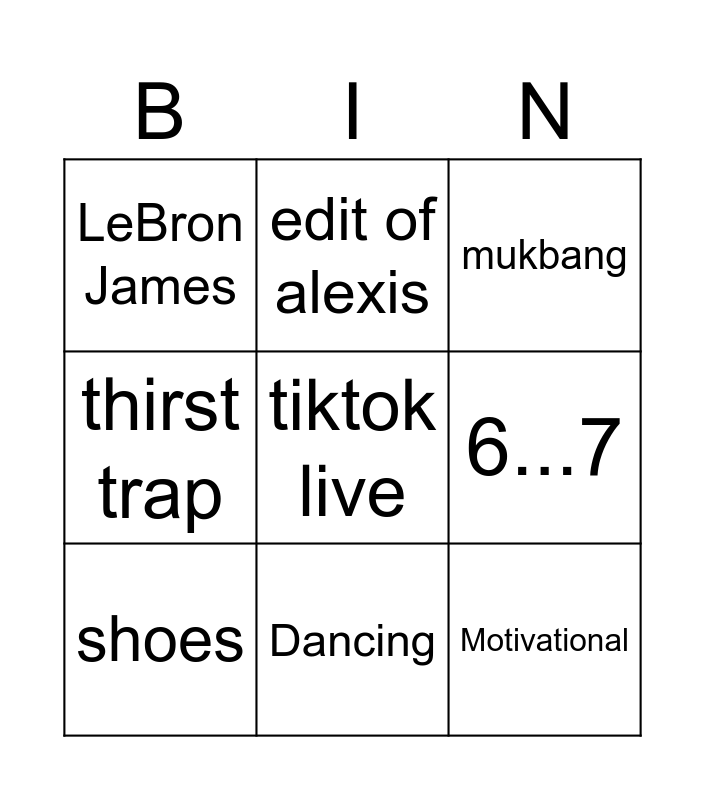 This bingo card has a free space and 8 words: 6...7, mukbang, edit of alexis, shoes, LeBron James, Motivational, thirst trap and Dancing.