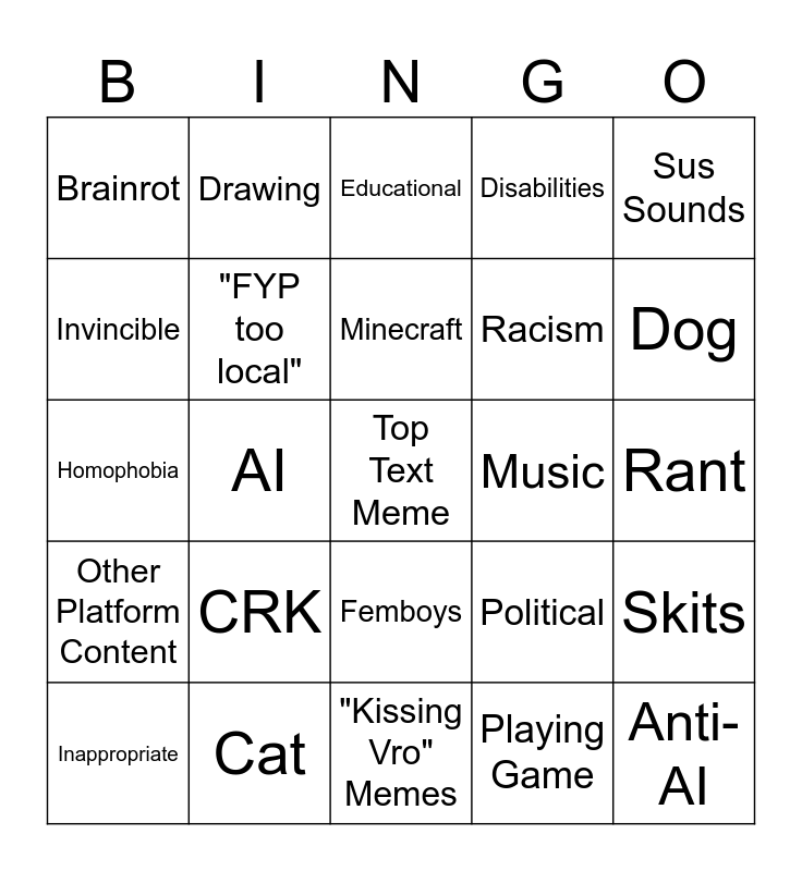 This bingo card has a free space and 24 words: CRK, Cat, Minecraft, Inappropriate, Sus Sounds, Brainrot, Invincible, Drawing, Music, Femboys, Racism, Homophobia, Political, Skits, "FYP too local", Playing Game, Rant, Educational, Dog, AI, Anti-AI, Other Platform Content, Disabilities and "Kissing Vro" Memes.