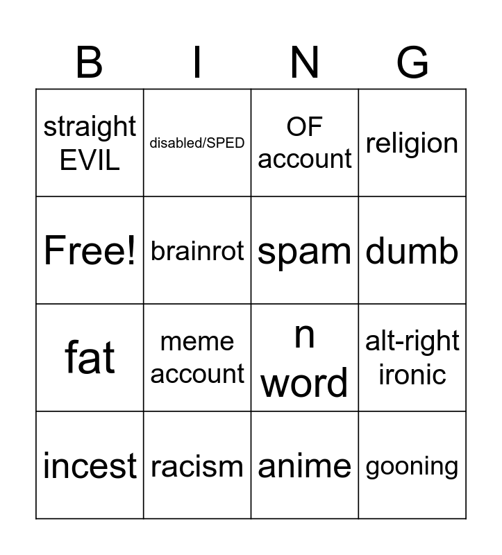 This bingo card has 16 words: racism, alt-right ironic, OF account, straight EVIL, fat, disabled/SPED, n word, anime, Free!, brainrot, incest, religion, meme account, dumb, spam and gooning.