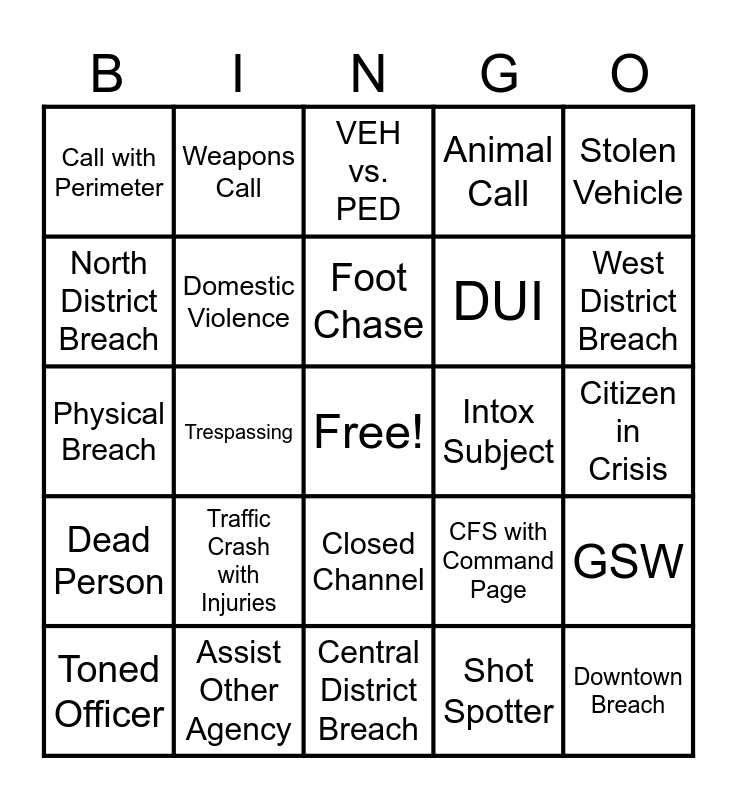 This bingo card has a free space and 25 words: Toned Officer, Traffic Crash with Injuries, Foot Chase, Shot Spotter, West District Breach, Call with Perimeter, Weapons Call, VEH vs. PED, DUI, GSW, Physical Breach, Domestic Violence, CFS with Command Page, Downtown Breach, North District Breach, Assist Other Agency, Central District Breach, Animal Call, Citizen in Crisis, Dead Person, Trespassing, Closed Channel, Intox Subject, Stolen Vehicle and Noise Complaint.