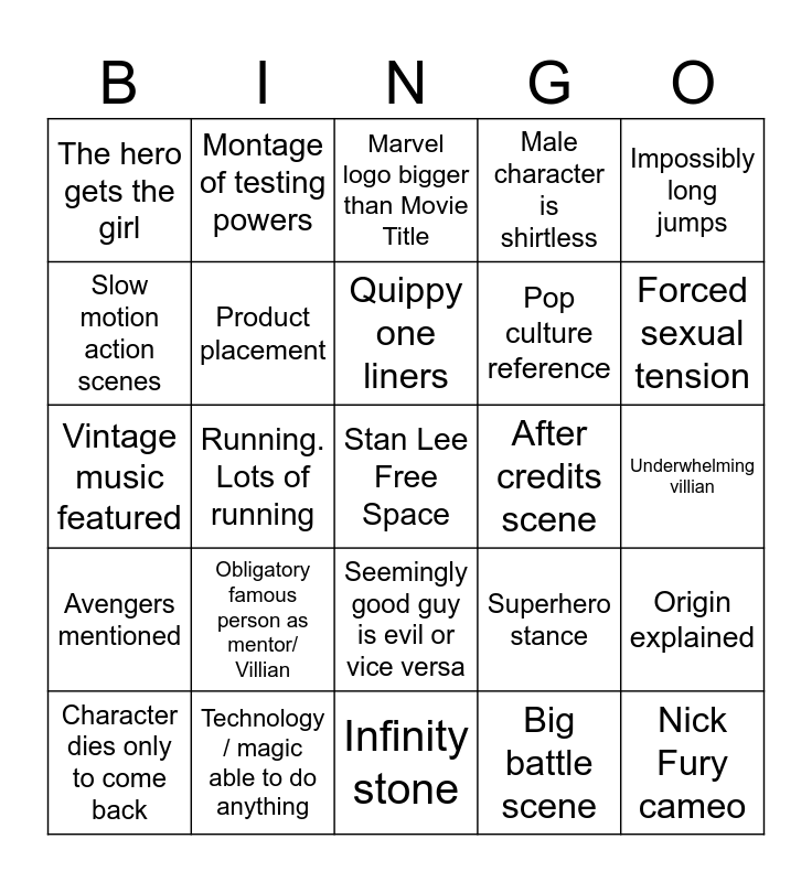 This bingo card has a free space and 24 words: Character dies only to come back, Obligatory famous person as mentor/ Villian, Quippy one liners, Big battle scene, Impossibly long jumps, The hero gets the girl, Montage of testing powers, Marvel logo bigger than Movie Title, After credits scene, Underwhelming villian, Vintage music featured, Product placement, Superhero stance, Origin explained, Slow motion action scenes, Technology / magic able to do anything, Infinity stone, Male character is shirtless, Forced sexual tension, Avengers mentioned, Running. Lots of running, Seemingly good guy is evil or vice versa, Pop culture reference and Nick Fury cameo.