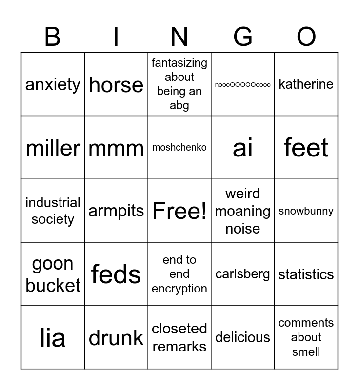 This bingo card has a free space and 24 words: feds, drunk, moshchenko, lia, katherine, anxiety, miller, horse, weird moaning noise, end to end encryption, ai, industrial society, carlsberg, statistics, mmm, delicious, snowbunny, fantasizing about being an abg, feet, armpits, comments about smell, goon bucket, noooOOOOOoooo and closeted remarks.