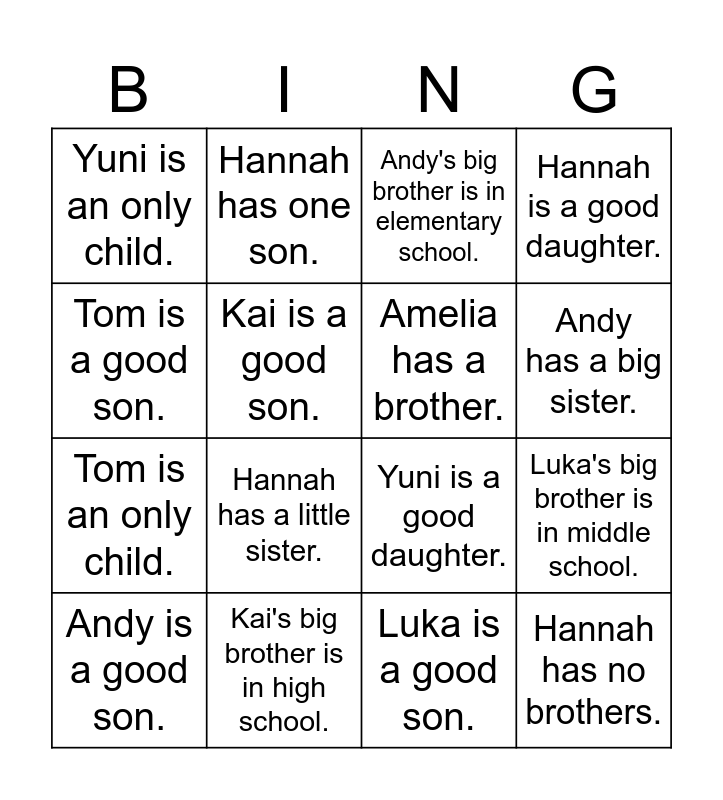 This bingo card has 16 words: Kai's big brother is in high school., Luka's big brother is in middle school., Andy's big brother is in elementary school., Yuni is an only child., Tom is an only child., Hannah has one son., Yuni is a good daughter., Luka is a good son., Tom is a good son., Kai is a good son., Andy is a good son., Hannah is a good daughter., Hannah has a little sister., Andy has a big sister., Amelia has a brother. and Hannah has no brothers..