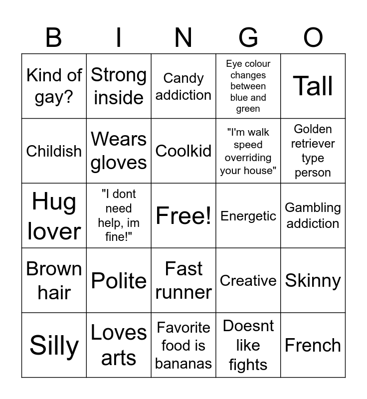 This bingo card has a free space and 24 words: Polite, Loves arts, Coolkid, Silly, Tall, Kind of gay?, Childish, Strong inside, Energetic, Fast runner, "I'm walk speed overriding your house", Hug lover, Creative, Skinny, Wears gloves, Doesnt like fights, Gambling addiction, Candy addiction, Golden retriever type person, "I dont need help, im fine!", French, Brown hair, Eye colour changes between blue and green and Favorite food is bananas.