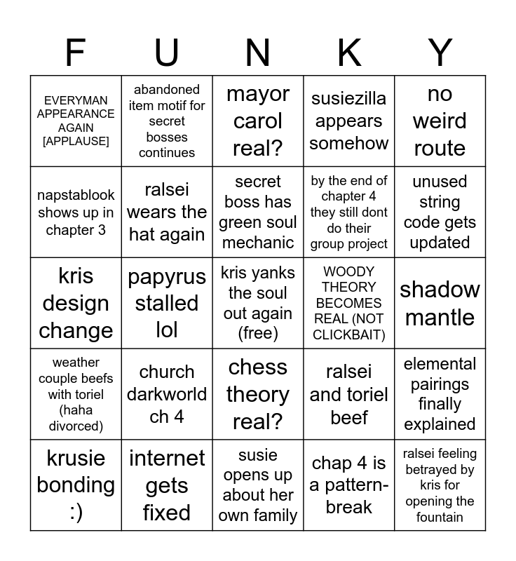 This bingo card has a free space and 24 words: church darkworld ch 4, internet gets fixed, secret boss has green soul mechanic, krusie bonding :), no weird route, EVERYMAN APPEARANCE AGAIN [APPLAUSE], napstablook shows up in chapter 3, abandoned item motif for secret bosses continues, WOODY THEORY BECOMES REAL (NOT CLICKBAIT), chess theory real?, by the end of chapter 4 they still dont do their group project, kris design change, ralsei and toriel beef, elemental pairings finally explained, ralsei wears the hat again, chap 4 is a pattern-break, shadow mantle, mayor carol real?, unused string code gets updated, papyrus stalled lol, ralsei feeling betrayed by kris for opening the fountain, weather couple beefs with toriel (haha divorced), susiezilla appears somehow and susie opens up about her own family.