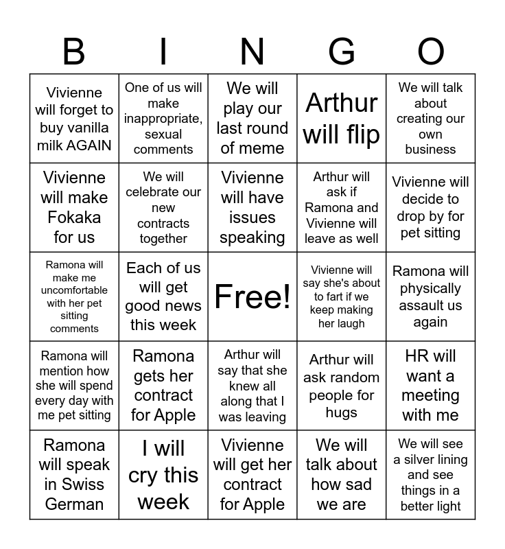 This bingo card has a free space and 24 words: Ramona gets her contract for Apple, I will cry this week, Vivienne will have issues speaking, Ramona will speak in Swiss German, We will talk about creating our own business, Vivienne will forget to buy vanilla milk AGAIN, Vivienne will make Fokaka for us, One of us will make inappropriate, sexual comments, Vivienne will say she's about to fart if we keep making her laugh, Arthur will say that she knew all along that I was leaving, Arthur will ask if Ramona and Vivienne will leave as well, Ramona will make me uncomfortable with her pet sitting comments, Arthur will ask random people for hugs, HR will want a meeting with me, We will celebrate our new contracts together, We will talk about how sad we are, Ramona will physically assault us again, We will play our last round of meme, Vivienne will decide to drop by for pet sitting, Each of us will get good news this week, We will see a silver lining and see things in a better light, Ramona will mention how she will spend every day with me pet sitting, Arthur will flip and Vivienne will get her contract for Apple.