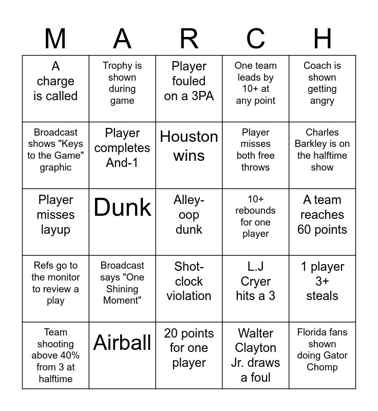 This bingo card has 30 words: Airball, 1 player makes 3 3s, Dunk, Player fouls out, A charge is called, Player fouled on a 3PA, Player completes And-1, Shot-clock violation, 10+ rebounds for one player, 20 points for one player, A team reaches 60 points, Alley-oop dunk, Walter Clayton Jr. draws a foul, Florida fans shown doing Gator Chomp, Charles Barkley is on the halftime show, A jumpball is called, L.J Cryer hits a 3, Refs go to the monitor to review a play, Broadcast says "One Shining Moment", Coach is shown getting angry, Player misses layup, Fans with body paint are shown, Trophy is shown during game, Player misses both free throws, Broadcast shows "Keys to the Game" graphic, One team leads by 10+ at any point, 1 player 3+ steals, Team shooting above 40% from 3 at halftime, Houston wins and Florida wins the tip-off.