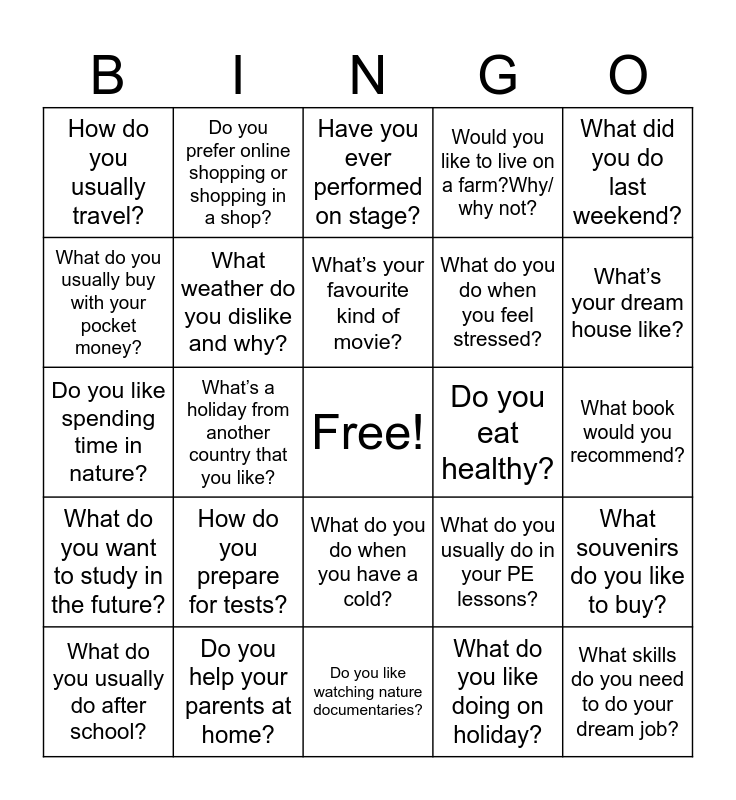 This bingo card has a free space and 24 words: How do you prepare for tests?, Do you help your parents at home?, What’s your favourite kind of movie?, What do you usually do after school?, What did you do last weekend?, How do you usually travel?, What do you usually buy with your pocket money?, Do you prefer online shopping or shopping in a shop?, Do you eat healthy?, What do you do when you have a cold?, What do you do when you feel stressed?, Do you like spending time in nature?, What do you usually do in your PE lessons?, What souvenirs do you like to buy?, What weather do you dislike and why?, What do you like doing on holiday?, What book would you recommend?, Have you ever performed on stage?, What’s your dream house like?, What’s a holiday from another country that you like?, What skills do you need to do your dream job?, What do you want to study in the future?, Would you like to live on a farm?Why/ why not? and Do you like watching nature documentaries?.