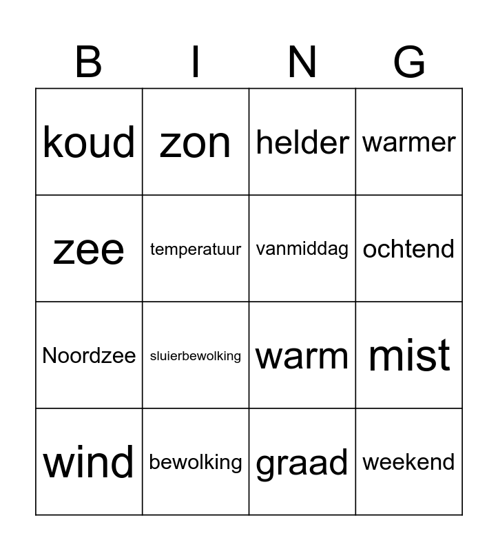 This bingo card has 16 words: bewolking, mist, helder, koud, Noordzee, zon, warm, graad, zee, temperatuur, wind, warmer, sluierbewolking, ochtend, vanmiddag and weekend.