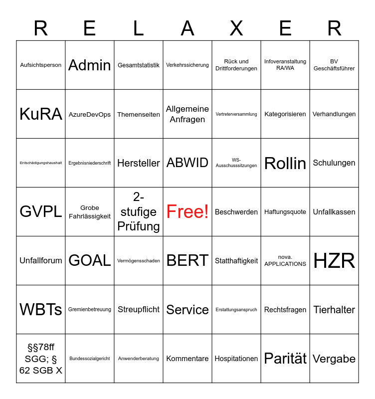 This bingo card has a free space and 48 words: Unfallforum, Grobe Fahrlässigkeit, Anwenderberatung, BERT, Vertreterversammlung, Haftungsquote, BV Geschäftsführer, §§78ff SGG; § 62 SGB X, Ergebnisniederschrift, 2-stufige Prüfung, Verkehrssicherung, Rück und Drittforderungen, Rollin, Schulungen, GVPL, Gremienbetreuung, Gesamtstatistik, ABWID, Erstattungsanspruch, Infoveranstaltung RA/WA, Verhandlungen, KuRA, Admin, Themenseiten, Hospitationen, Kategorisieren, Unfallkassen, WBTs, GOAL, Hersteller, Service, WS-Ausschusssitzungen, Rechtsfragen, Tierhalter, Aufsichtsperson, Bundessozialgericht, Vermögensschaden, Kommentare, Beschwerden, Parität, HZR, Entschädigungshaushalt, AzureDevOps, Streupflicht, Allgemeine Anfragen, Statthaftigkeit, nova. APPLICATIONS and Vergabe.