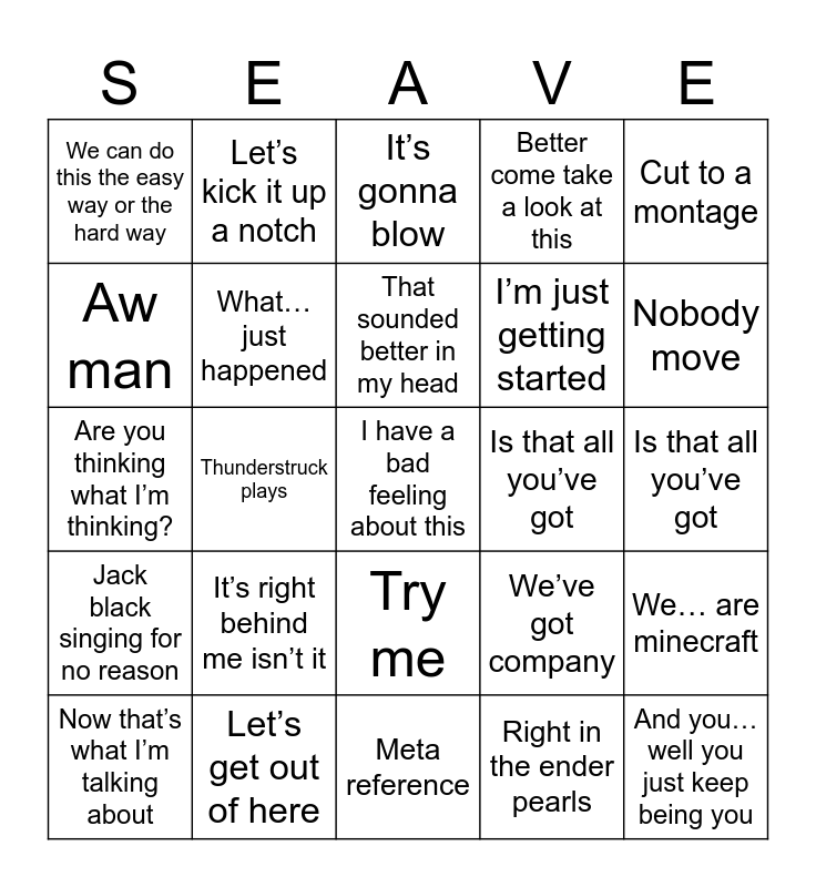 This bingo card has a free space and 24 words: It’s right behind me isn’t it, Let’s get out of here, That sounded better in my head, Now that’s what I’m talking about, Cut to a montage, We can do this the easy way or the hard way, Aw man, Let’s kick it up a notch, Is that all you’ve got, Try me, I’m just getting started, Are you thinking what I’m thinking?, We’ve got company, We… are minecraft, What… just happened, Right in the ender pearls, Is that all you’ve got, It’s gonna blow, Nobody move, Thunderstruck plays, And you… well you just keep being you, Jack black singing for no reason, Better come take a look at this and Meta reference.