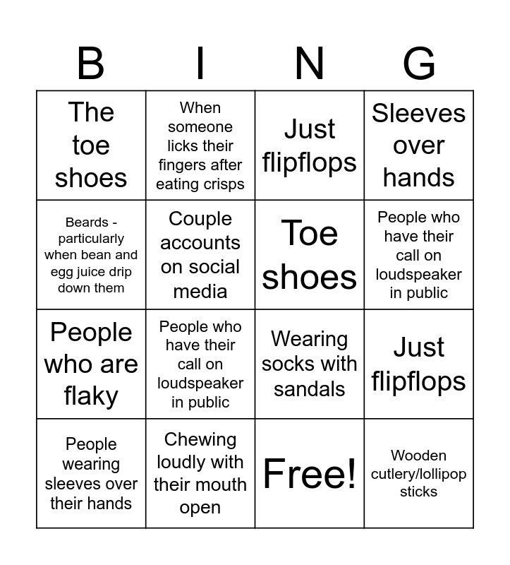 This bingo card has 17 words: Free!, People wearing sleeves over their hands, Just flipflops, The toe shoes, People who have their call on loudspeaker in public, Sleeves over hands, Just flipflops, Toe shoes, People who have their call on loudspeaker in public, Couple accounts on social media, Chewing loudly with their mouth open, Wearing socks with sandals, Beards - particularly when bean and egg juice drip down them, When someone licks their fingers after eating crisps, People who are flaky, Waiting for a red traffic light to go green when crossing the road and Wooden cutlery/lollipop sticks.