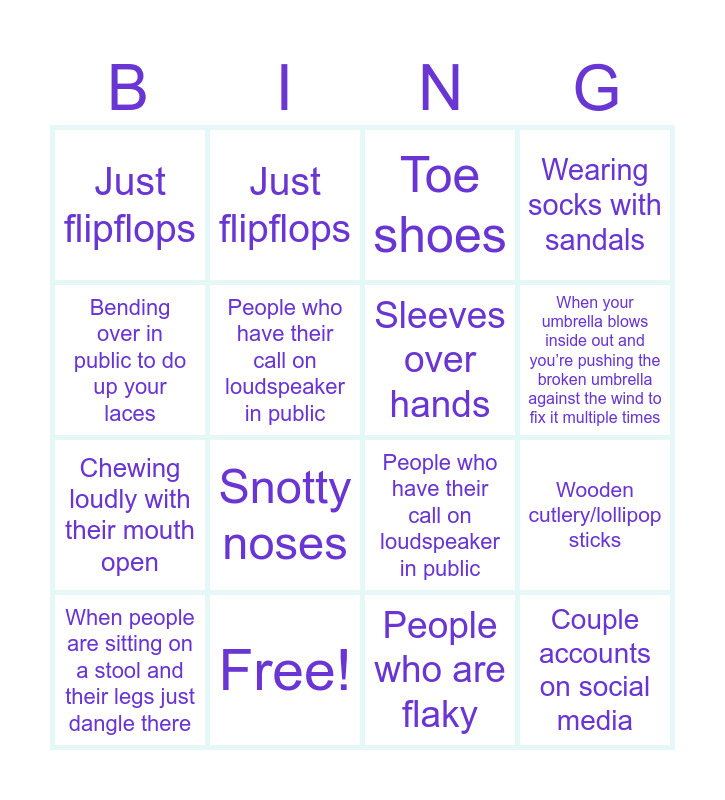This bingo card has 22 words: Free!, People wearing sleeves over their hands, Just flipflops, The toe shoes, People who have their call on loudspeaker in public, Sleeves over hands, Just flipflops, Toe shoes, People who have their call on loudspeaker in public, Couple accounts on social media, Chewing loudly with their mouth open, Wearing socks with sandals, Beards - particularly when bean and egg juice drip down them, When someone licks their fingers after eating crisps, People who are flaky, Waiting for a red traffic light to go green when crossing the road, Wooden cutlery/lollipop sticks, When people are sitting on a stool and their legs just dangle there, Snotty noses, Bending over in public to do up your laces, When your umbrella blows inside out and you’re pushing the broken umbrella against the wind to fix it multiple times and If someone you’re with calls bingo wrong at the bingo.