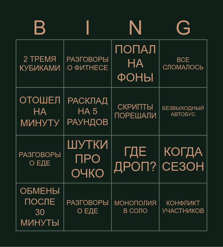 This bingo card has 18 words: ШУТКИ ПРО ОЧКО, КОНФЛИКТ УЧАСТНИКОВ, ПОПАЛ НА ФОНЫ, 2 ТРЕМЯ КУБИКАМИ, ГДЕ ДРОП?, ВСЕ СЛОМАЛОСЬ, ОБМЕНЫ ПОСЛЕ 30 МИНУТЫ, РАЗГОВОРЫ О ФИТНЕСЕ, БЕЗВЫХОДНЫЙ АВТОБУС, РАЗГОВОРЫ О ЕДЕ, МОНОПОЛИЯ В СОЛО, ОТОШЕЛ НА МИНУТУ, КОГДА СЕЗОН, РАСКЛАД НА 5 РАУНДОВ, СКРИПТЫ ПОРЕШАЛИ, УЧАСТНИК НЕ ПРИШЕЛ, РАЗГОВОРЫ О ЕДЕ and СТРИМ НАСТРОЕК.