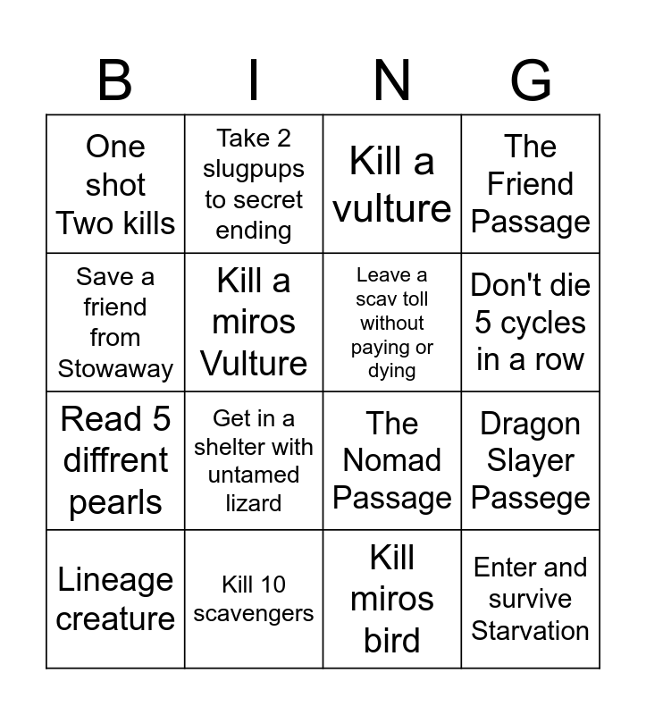 This bingo card has 16 words: Kill 10 scavengers, Dragon Slayer Passege, Kill a vulture, One shot Two kills, Read 5 diffrent pearls, Take 2 slugpups to secret ending, The Nomad Passage, Kill miros bird, Save a friend from Stowaway, Kill a miros Vulture, Lineage creature, The Friend Passage, Get in a shelter with untamed lizard, Don't die 5 cycles in a row, Leave a scav toll without paying or dying and Enter and survive Starvation.