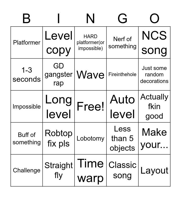This bingo card has a free space and 24 words: Robtop fix pls, Straight fly, Wave, Challenge, NCS song, Platformer, 1-3 seconds, Level copy, Auto level, Lobotomy, Fireinthehole, Impossible, Less than 5 objects, Make your..., GD gangster rap, Classic song, Actually fkin good, HARD platformer(or impossible), Just some random decorations, Long level, Layout, Buff of something, Nerf of something and Time warp.