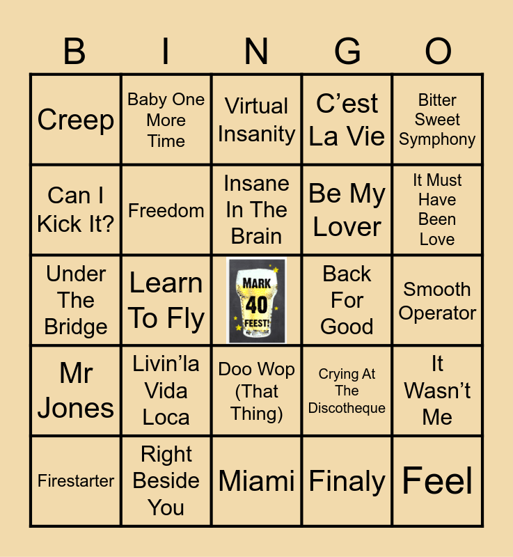 This bingo card has a free space and 49 words: All That She Wants, Feel, Little Miss Can’t Be Wrong, Miami, Livin’la Vida Loca, Killer, Baby One More Time, Jump, Can I Kick It?, Gangsta’s Paradise, Freedom, C’est La Vie, It Wasn’t Me, Crying At The Discotheque, I Want It That Way, Groove Is In The Heart, Insane In The Brain, Back For Good, Mambo Nr 5, Bitter Sweet Symphony, Learn To Fly, Finaly, Creep, Be My Lover, Brother Louie, It Must Have Been Love, Firestarter, Losing My Religion, Doo Wop (That Thing), Mr Jones, No Scrubs, November Rain, Pony, Ready Or Not, Right Beside You, Say My Name, Show Me Love, Smells Like Teen Spirit, Smooth Operator, Thank You, The Most Beautiful Girl, Torn, Two Can Play That Game, Two Princes, Under The Bridge, Virtual Insanity, Wannabe, What Is Love and Zombie.