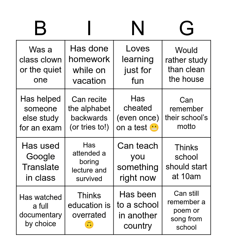 This bingo card has 25 words: Has taken an online course recently, Thinks they’d make a great teacher, Can remember their school’s motto, Has ever fallen asleep in class, Has helped someone else study for an exam, Was a class clown or the quiet one, Can recite the alphabet backwards (or tries to!), Has done homework while on vacation, Thinks education is overrated 🙃, Speaks more than two languages, Has used Google Translate in class, Can teach you something right now, Has studied something totally random (like wine tasting or calligraphy), Has made a friend through school, Has cheated (even once) on a test 😬, Still keeps in touch with a teacher, Has been to a school in another country, Loves learning just for fun, Has attended a boring lecture and survived, Thinks school should start at 10am, Has watched a full documentary by choice, Has joined a study group, Can still remember a poem or song from school, Would rather study than clean the house and Has ever had a crush on a teacher 😏.