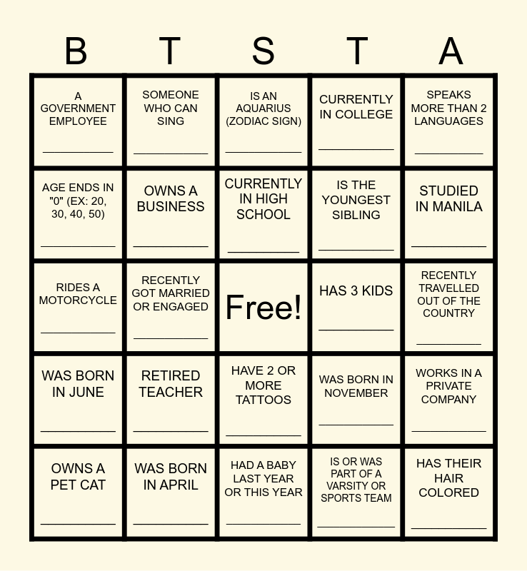 This bingo card has a free space and 24 words: RETIRED TEACHER __________, WAS BORN IN APRIL __________, CURRENTLY IN HIGH SCHOOL __________, OWNS A PET CAT __________, SPEAKS MORE THAN 2 LANGUAGES ___________, A GOVERNMENT EMPLOYEE ____________, AGE ENDS IN "0" (EX: 20, 30, 40, 50) ____________, SOMEONE WHO CAN SING ____________, HAS 3 KIDS __________, HAVE 2 OR MORE TATTOOS ___________, IS THE YOUNGEST SIBLING ___________, RIDES A MOTORCYCLE ____________, WAS BORN IN NOVEMBER ____________, WORKS IN A PRIVATE COMPANY ____________, OWNS A BUSINESS __________, IS OR WAS PART OF A VARSITY OR SPORTS TEAM ______________, RECENTLY TRAVELLED OUT OF THE COUNTRY ___________, IS AN AQUARIUS (ZODIAC SIGN) _____________, STUDIED IN MANILA __________, RECENTLY GOT MARRIED OR ENGAGED ____________, HAS THEIR HAIR COLORED ___________, WAS BORN IN JUNE __________, CURRENTLY IN COLLEGE ___________ and HAD A BABY LAST YEAR OR THIS YEAR ____________.