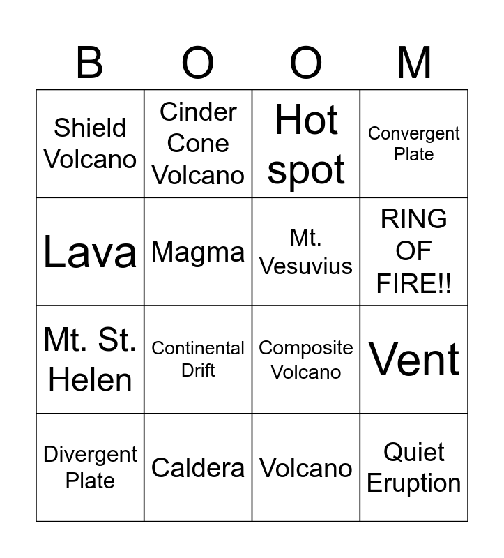 This bingo card has 16 words: Caldera, Vent, Hot spot, Shield Volcano, Mt. St. Helen, Cinder Cone Volcano, Composite Volcano, Volcano, Lava, Magma, Divergent Plate, Convergent Plate, Continental Drift, RING OF FIRE!!, Mt. Vesuvius and Quiet Eruption.