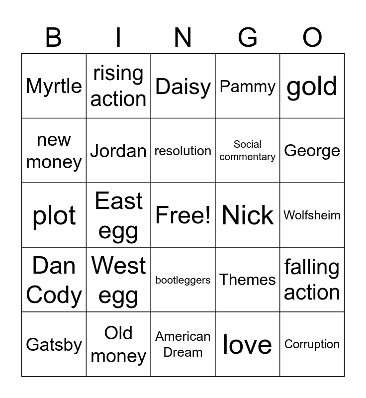 This bingo card has a free space and 29 words: Gatsby, Tom, East egg, Luxury, Myrtle, Daisy, Jordan, West egg, Nick, Old money, Wolfsheim, Corruption, American Dream, love, George, Materialism, bootleggers, Dan Cody, gold, plot, Themes, Climax, Social commentary, new money, Pammy, rising action, falling action, resolution and characterization.
